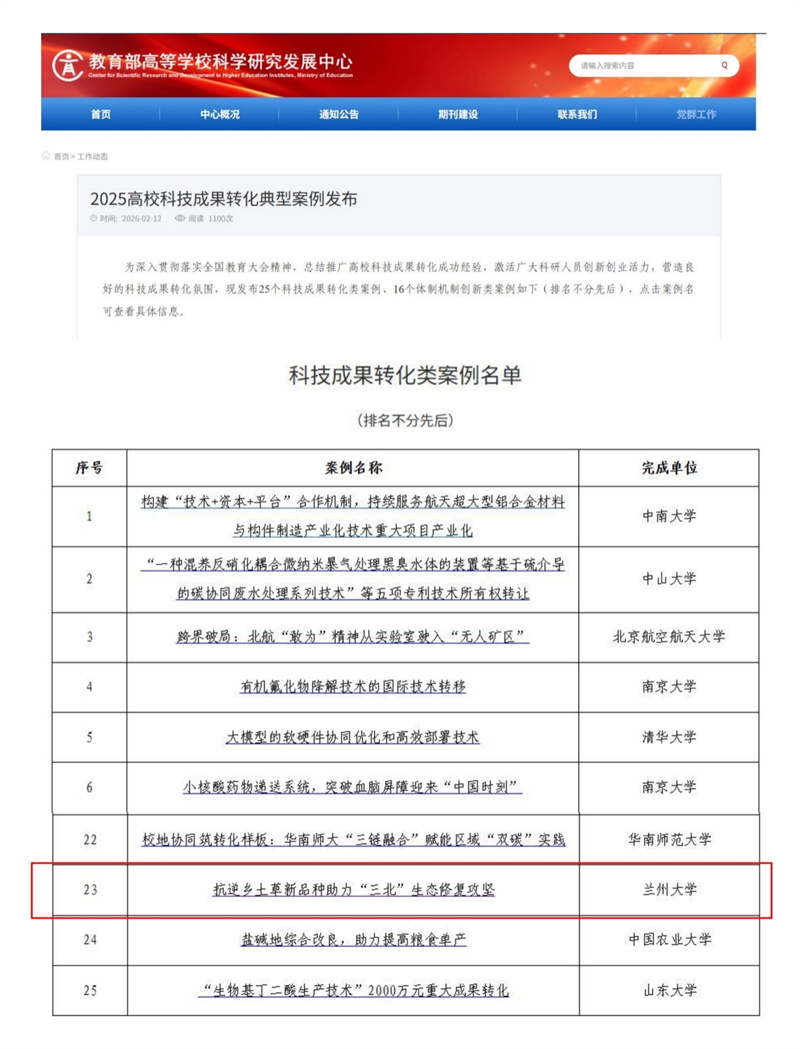 近日,教育部发布2025年度高校科技成果转化典型案例,兰州大学申报的《抗逆乡土草新品种助力“三北”生态修复攻坚》作为全国25个科技成果转化类典型案例成功入选。该案例是兰大扎根西北、服务国家战略的系统性成果,生动展示了学校通过强化抗逆草种质资源创新与关键技术攻关,有效破解了高寒干旱地区修复用种匮乏的难题。这一实践为高校通过科研成果支撑国家重大生态工程、服务经济社会高质量发展提供了可复制、可推广的“兰大模式”。
